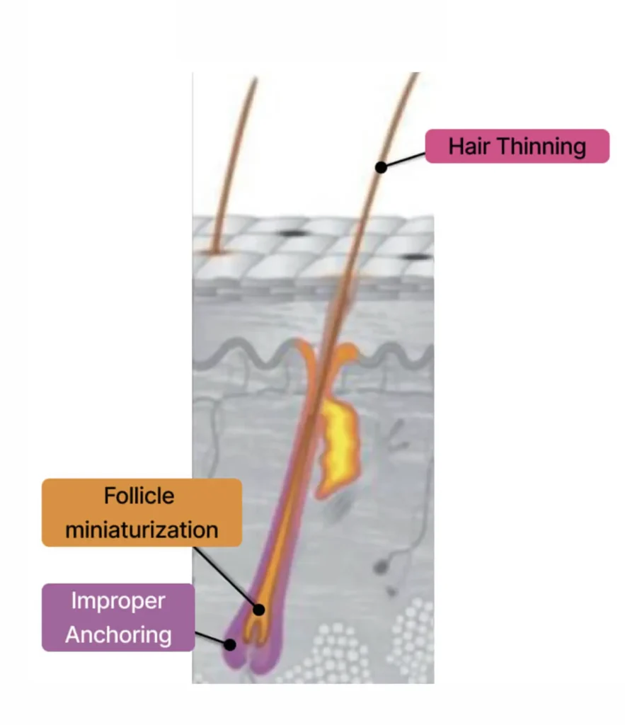 Genetic predisposition and hormonal imbalance disrupt the scalp’s natural growth cycle, weakening follicles and shortening the anagen phase.