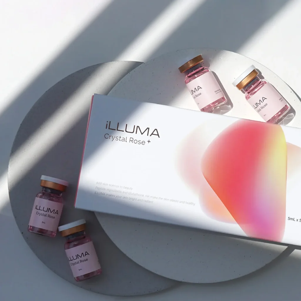 ‘iLLUMA Crystal Rose+’ is a highly concentrated ampoule containing Peptide, Glutathione, and Hyaluronic Acid as main ingredients.